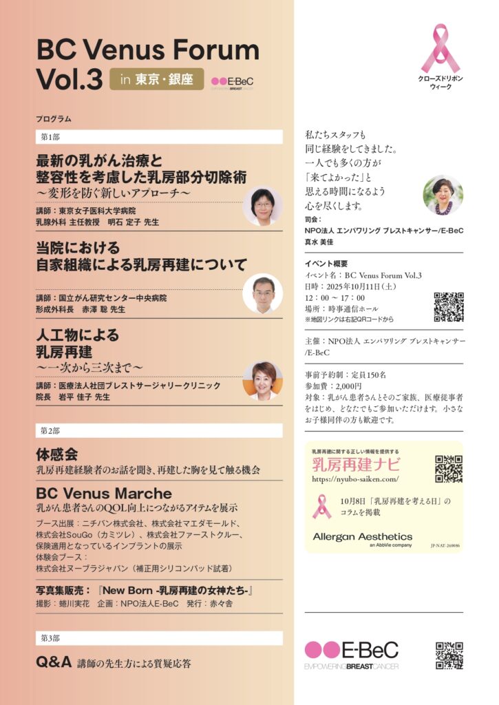 2025年10月11日(土)にNPO法人E-BeC主催セミナー、今知っておきたい!乳がん治療と乳房再建の最前線にて 講演を行います。